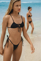 Flattering swimwear made from a nylon fabric made from a recycled fishnet. It delivers a classic shape and hues with ruched detail, thin adjustable tie straps with gold stoppers, and adjustable coverage for custom moderation.