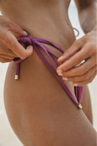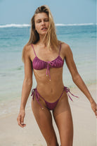 Flattering swimwear made from a nylon fabric made from a recycled fishnet. It delivers a classic shape and hues with ruched detail, thin adjustable tie straps with gold stoppers, and adjustable coverage for custom moderation.