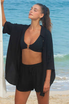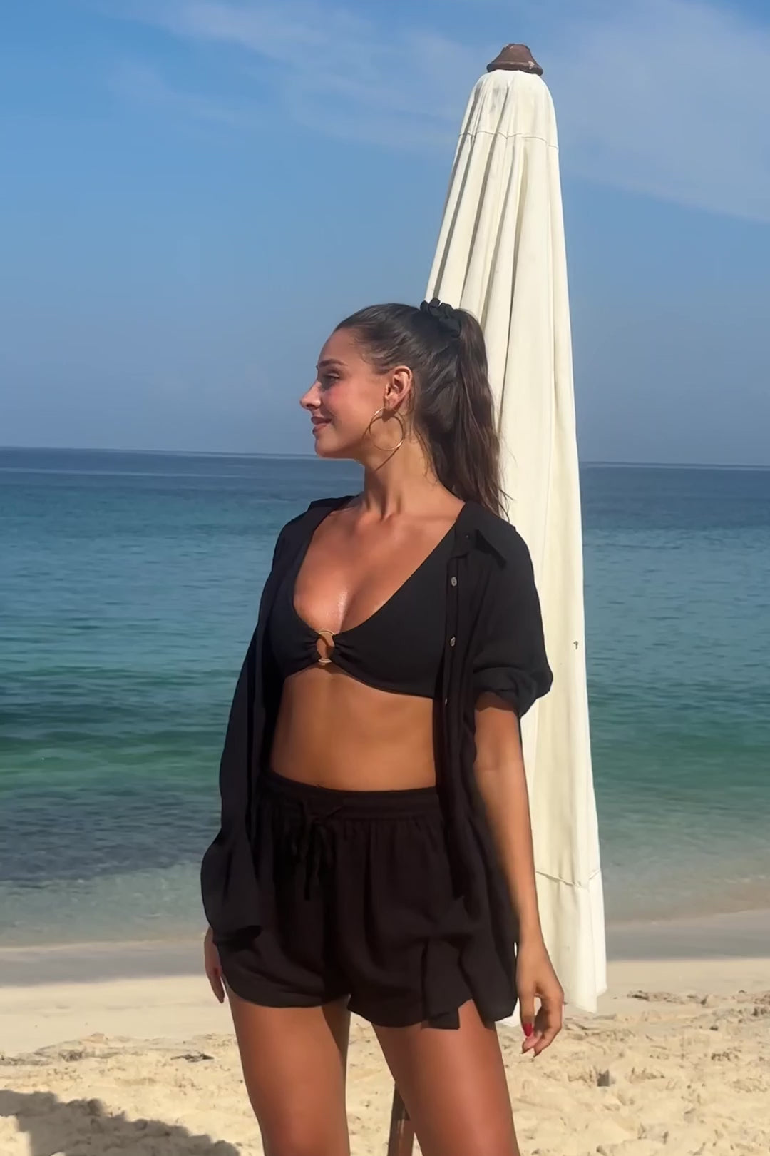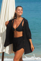 Flow set is made with very lightweight and breathable fabric. Oversized shirt with a relaxed fit and small shell buttons make a beautiful set with high waist shorts, elastic band and a drawstring for adjusting the fit and discreet side pockets.