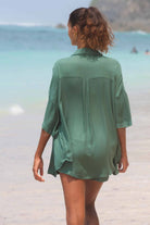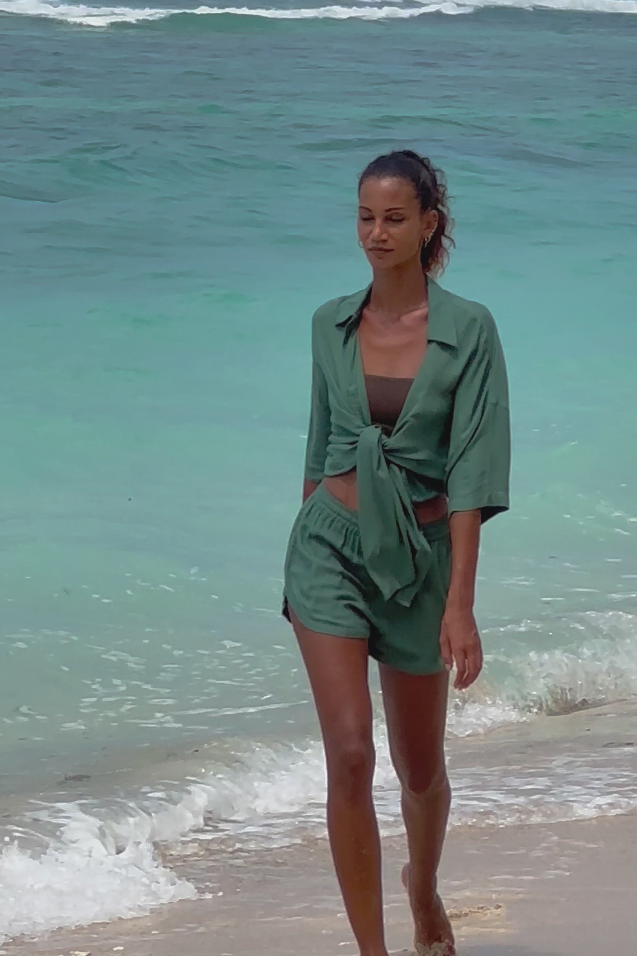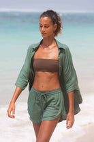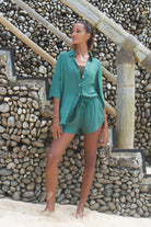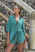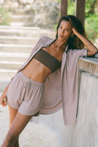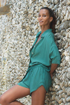 Flow set is made with very lightweight and breathable fabric. Oversized shirt with a relaxed fit and small shell buttons make a beautiful set with high waist shorts, elastic band and a drawstring for adjusting the fit and discreet side pockets.